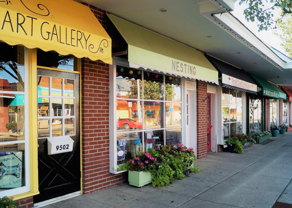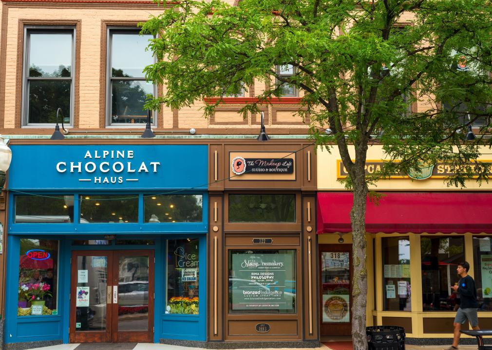 Culinary outlets, shops, and businesses line a tree-shaded sidewalk