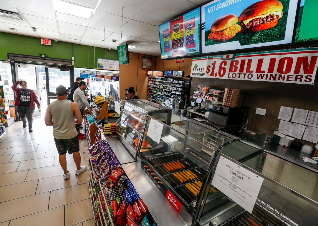 Customers filing in to 7/11 to purchase Powerball lottery tickets.