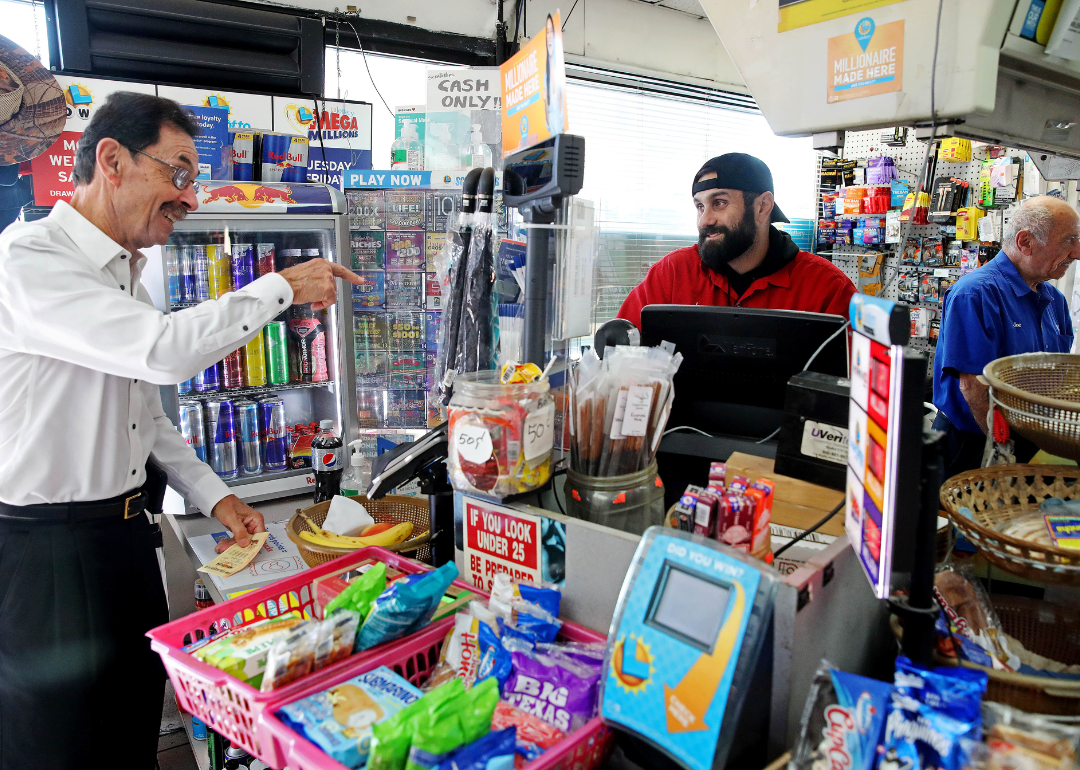 A cashier selling $200 worth of Mega Millions lottery tickets.