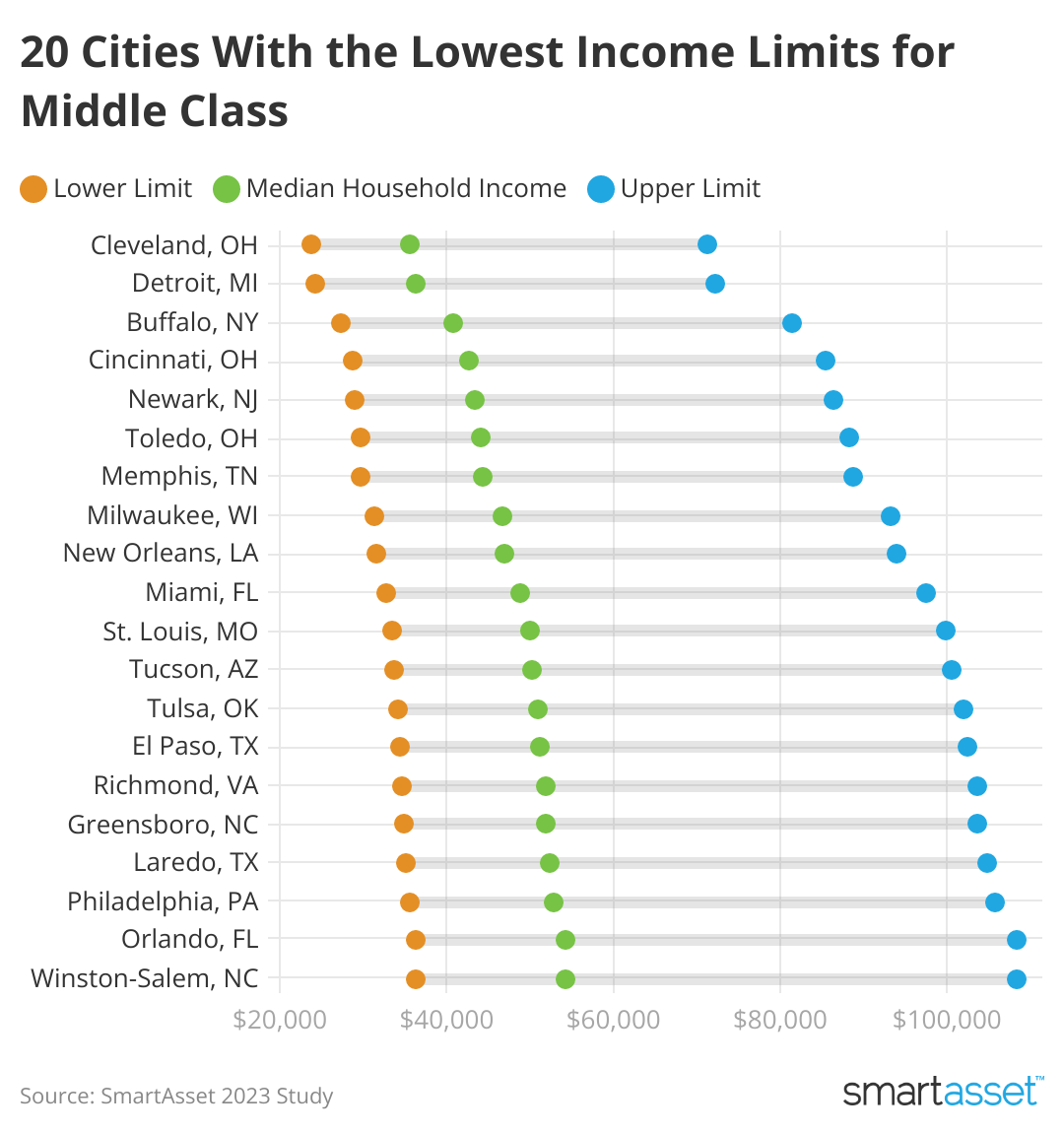 To determine the income limits to be in the middle class, SmartAsset analyzed U.S. Census Bureau’s 2021 1-year American Community Survey data for the median household income in all 50 states, as well as the 100 largest U.S. cities. The study relied on a variation of the Pew Research definition of middle-income households, which defines a middle class salary range by two-thirds to double the median U.S. salary. The analysis used the local median salary for states and large cities to account for the diversity of financial realities among locales.