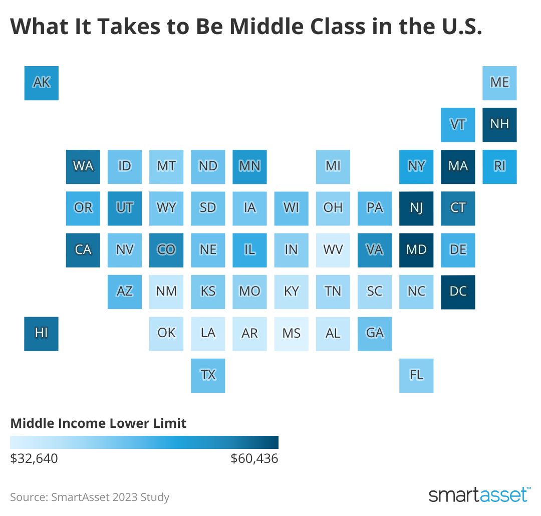Maryland, Washington D.C. and Massachusetts have the three highest floors for the middle class at a statewide level. In all three places, it takes an annual income of more than $60,000 for households to be considered middle class. New Jersey ($59,828) and New Hampshire ($59,272) round out the top five.