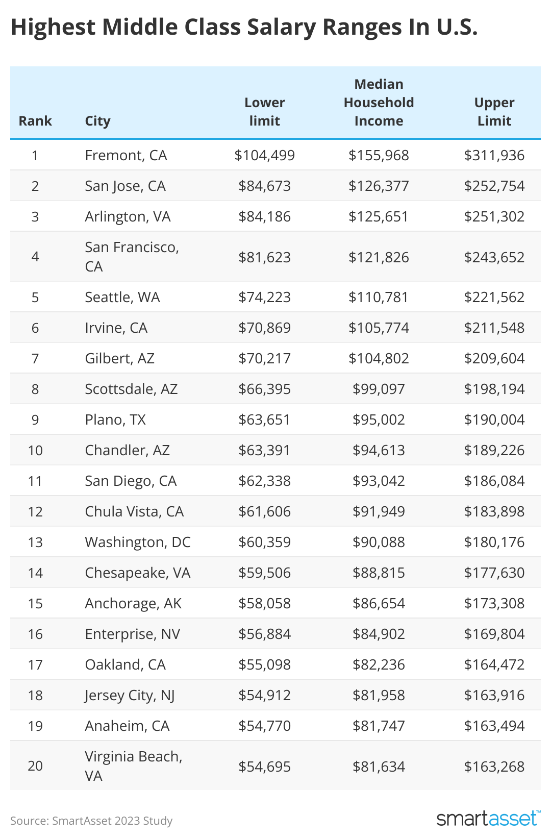 - You’re middle class even if you make $310,000 in this California city. Households that earn up to $311,936 per year in Fremont, California, are still technically considered middle class. That’s the highest ceiling for any city in the study – Fremont’s median household income ($155,968) is almost $30,000 more than the next highest city.
