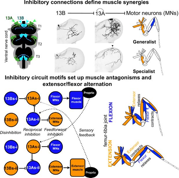 "Our work lays groundwork for future exploration of the functional contributions of inhibitory circuits to motor control," concluded the study. "While our experiments with multiple genetic lines labeling 13 A/B neurons consistently implicate these cells in leg coordination, ectopic expression in some lines raises the possibility that other neurons may also contribute to these phenotypes. In addition, other excitatory and inhibitory neural circuits, not yet identified, may also contribute to the generation of rhythmic leg movements. Future studies should identify such neurons that regulate rhythmic timing and their interactions with inhibitory circuits."