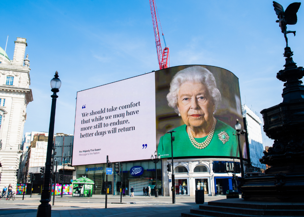[Pictured: An image of Queen Elizabeth II and quotes from her broadcast to the nation in relation to the coronavirus epidemic are displayed on screens in Piccadilly Circus on April 10, 2020, in London, England.]